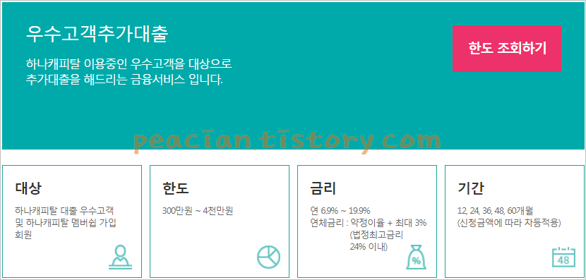 우수고객추가대출은 기존 우수고객 및 하나캐피탈 멤버쉽 가입 회원을 대상으로 300만원에서 4천만원까지 한도를 연 6.9~19.9%의 금리로 추가 이용 가능한 상품입니다. 신용평점에 따라 한도와 금리가 차등적용됩니다.