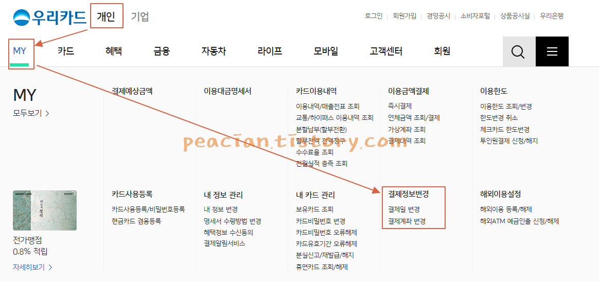우리카드를 예로 들어 결제일 변경 방법에 대해 알아보겠습니다.
