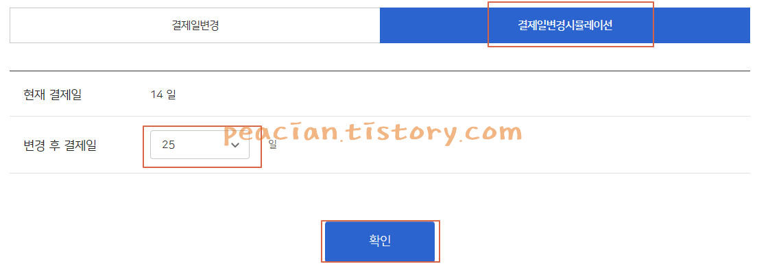 변경하기에 앞서 시뮬레이션을 통해 변경 후에 해당월과 이후의 결제일 및 이용기간 (일시불/할부, 현금서비스)을 확인할 수 있습니다.