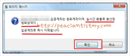 저는 입금할 계좌가 원화계좌이기 때문에 위와 같은 메시지가 뜨는데요. 원화통장으로 이체할 경우 실시간 환율이 적용되어 원화로 입금된다는 내용입니다. 우리은행의 경우 인터넷뱅킹으로 송금 시 지점에서 거래할때보다 30% 환율우대를 받을 수 있으니 참고하시기 바랍니다.