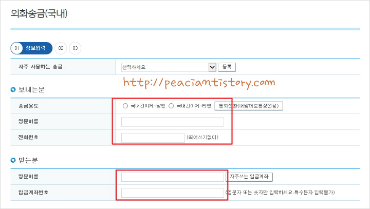 이 후 당행으로 보낼것인지 타행으로 보낼것인지를 선택한 뒤 보내는이와 받는이의 영문이름, 전화번호, 입금계좌번호를 입력합니다. 타행송금 시 오후 4시 이후, 당행송금시 오후 6시 이후에는 외화계좌로만 이체가 가능합니다. 해당 시간 이후 당일 처리를 원하는 경우에는 지점에 문의하시기 바랍니다.