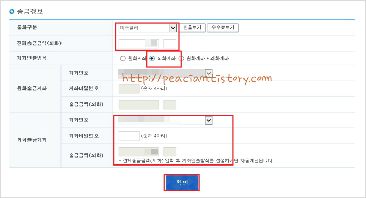다음으로 통화를 선택한 뒤 이체할 금액을 입력합니다. 인출방식은 외화계좌를 선택하면 출금계좌의 정보가 자동으로 입력됩니다. 해당계좌의 비밀번호를 입력한 뒤 확인을 클릭합니다.